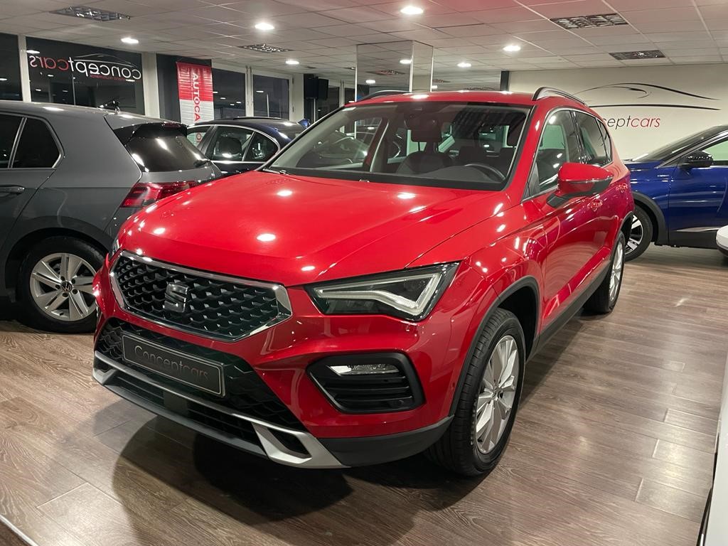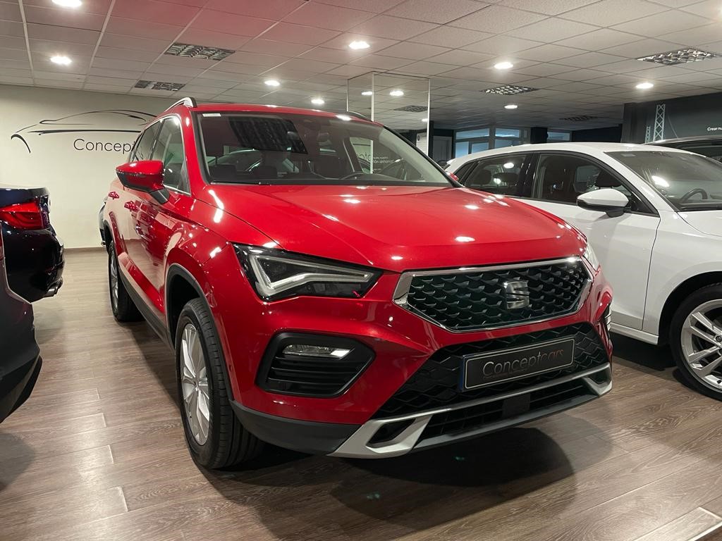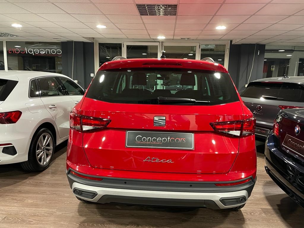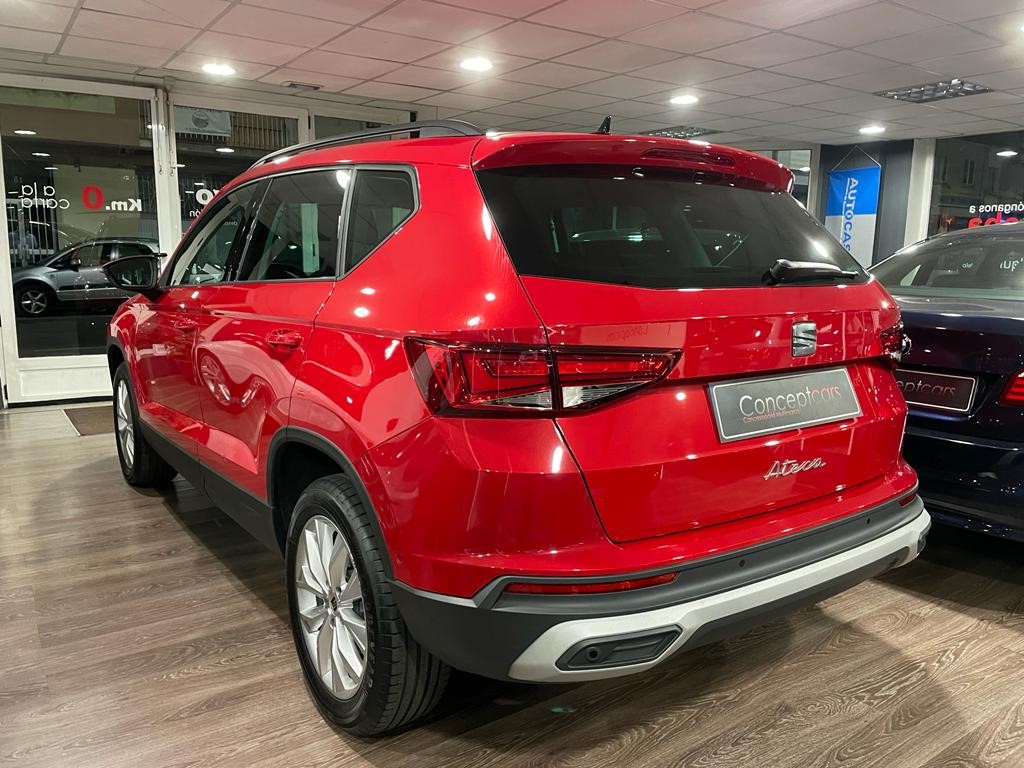 Seat Ateca Style 2.0 TDI DSG coche equipado con faros full led, acceso confort y arranque sin llave, sensor de aparcamiento delantero y trasero, sensor de luces y lluvia, control por voz, carga inalámbrica para smartphone, reconocimiento de señales, control de crucero adaptativo, asistente de cambio de carril, park assist, front assist, cuadro digital, navegación, full link, clima bizona, bluetooth+USB, espejos regulables y plegables eléctricos. 25.990 PVP financiando un min de 11.500€. 28.990 PVP de contado. Vehículo certificado de km y con revisión preentrega de 126 puntos. Conceptcars concesionario en Chantada y Monforte de Lemos